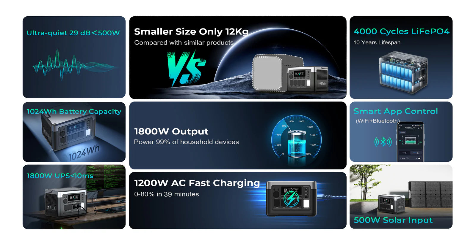 A smart-looking functional power station that can keep your home up and running in a power outage. [Perfect for 99% of home devices] The OUKITEL Power Station P1000E has an impressive 1024 Wh capacity and a powerful 1800 watt inverter that supports 99% of devices, including smartphones, speakers, fans, laptops, tablets, projectors and TVs. It is perfect for camping, motorhome trips and other family outings. The pure sine wave inverter delivers a constant voltage and protects devices from damage.